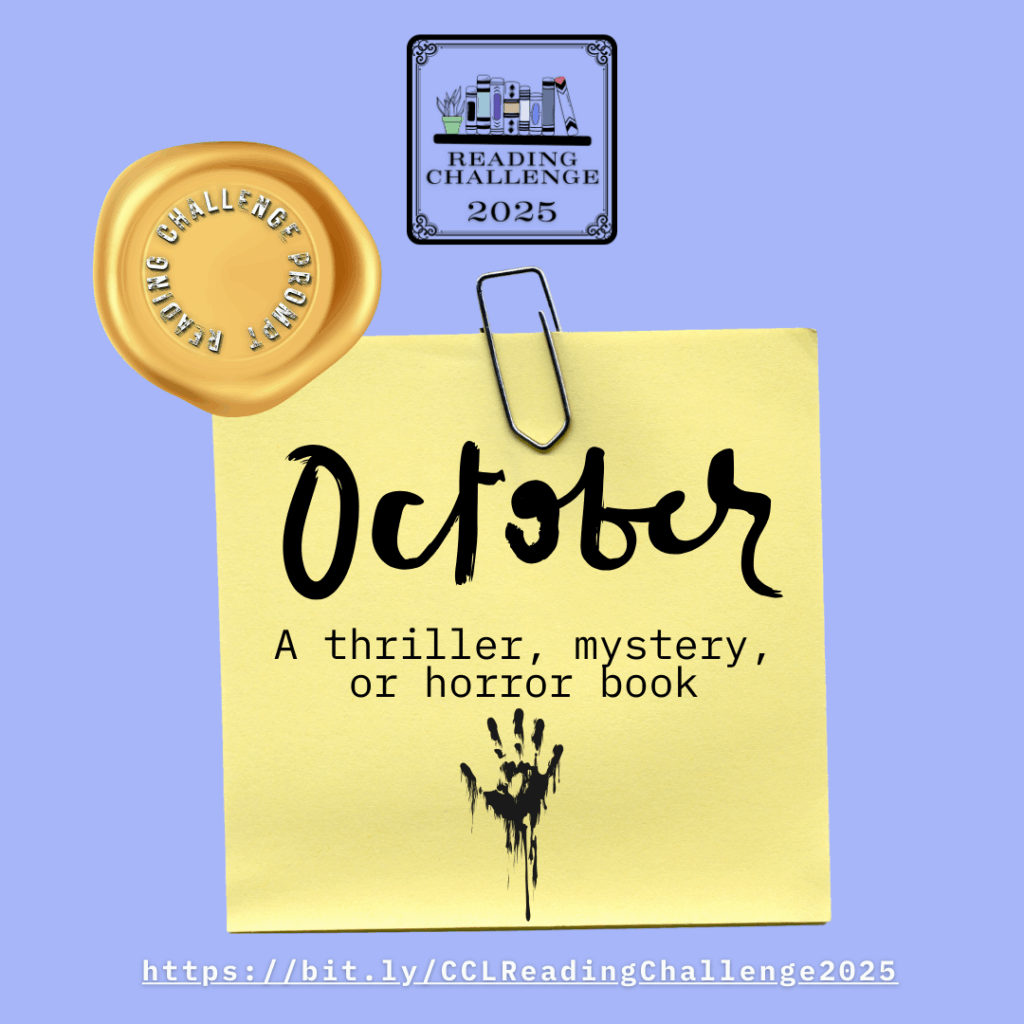 October’s here, and things are getting chilling… in the best way! This month’s Adult Reading Challenge invites you to sink into a thriller, mystery, or horror novel—perfect for crisp nights and eerie vibes. Whether it’s a whodunit, a haunted tale, or a psychological page-turner, let your next read keep you on the edge of your seat. Here is the link to the “Spooky Season” showcase.